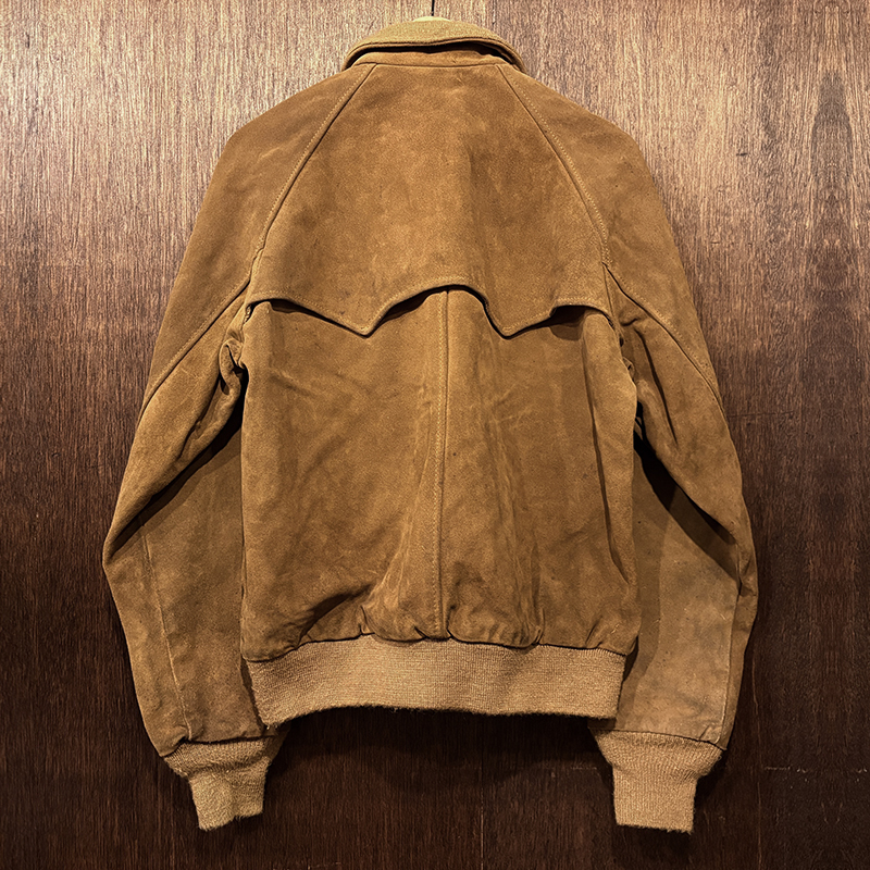 本品はショット社がおおよそ80年代あたりに極少数ラインナップさせたハリントンジャケットタイプのスエードレザージャケット、いわゆるスイングトップとも呼ばれるディテールを踏襲したモデルとなっており、フロントのフラップハンドウォーマーや背中のアンブレラシルエットのフラップカット、そして襟周りが2つのボタンで首元をスマートに覆うドッグイヤーカラーという大きな特徴があり、数多あるショットモデルの中でも非常に稀少なスタイルとなっています。