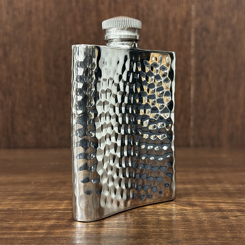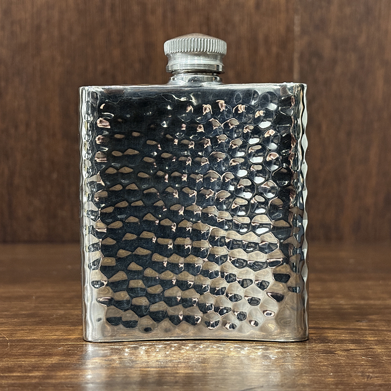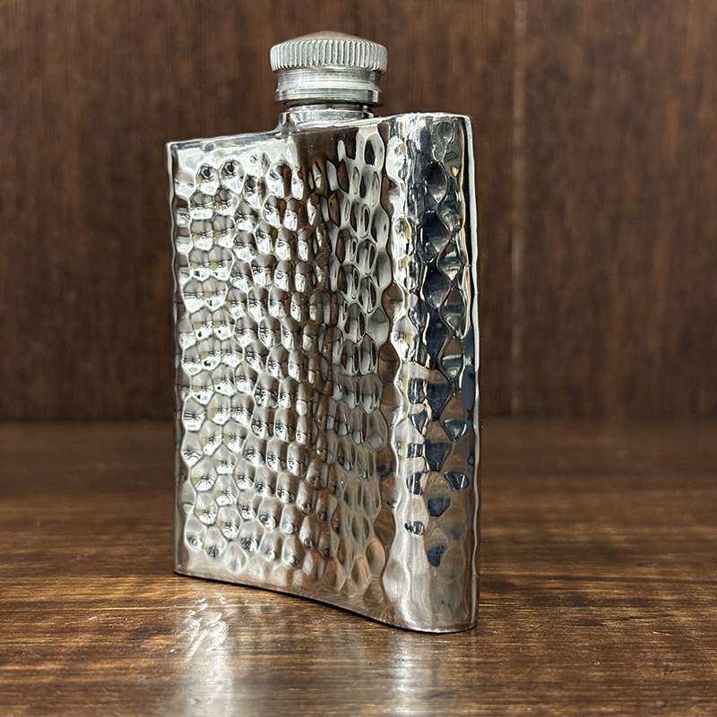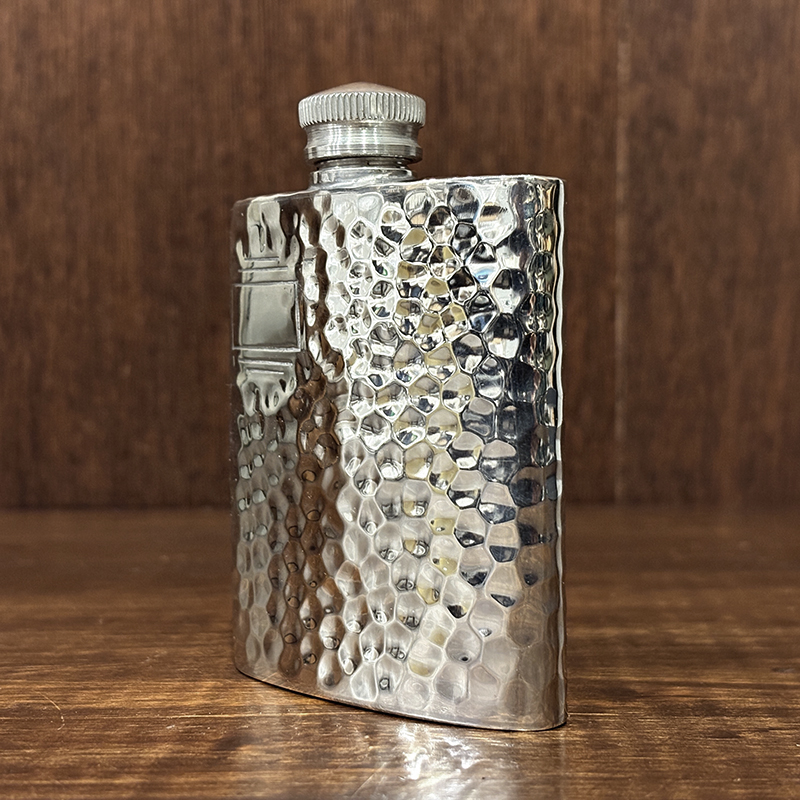 Shefield Samuel Peaceの非常に伝統的なハンマード処理のクラシックなオールド物のフラスクスキットル、当時でも希少な3oz仕様で手馴染み良くコンパクトに携行できます、クラシックな雰囲気のフィッシングはじめあらゆるアウトドアシーンにも、是非ご検討ください。
