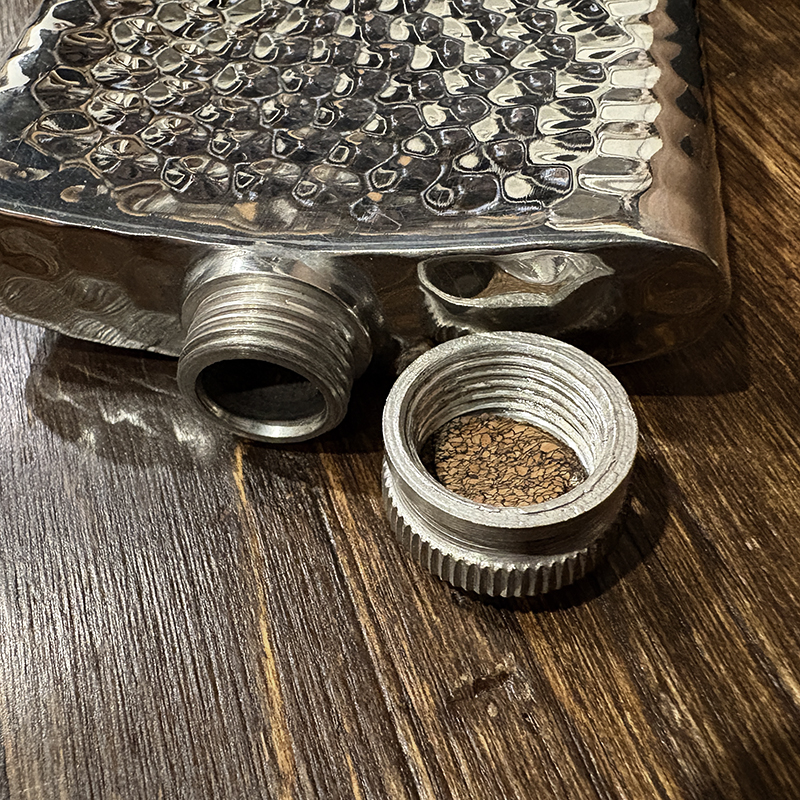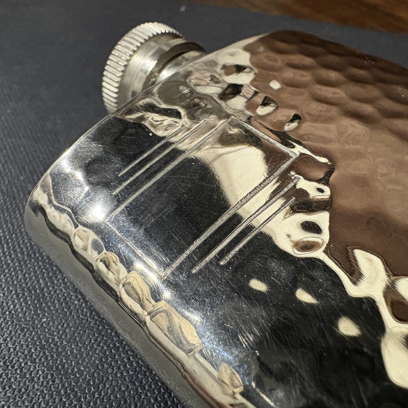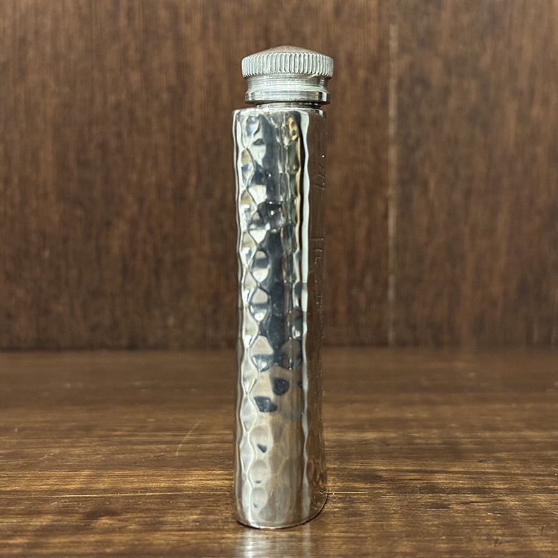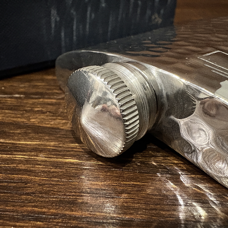 ボディ躯体には緻密に処理された非常に綺麗な起伏をもったハンマード処理が施されたボトルとなっており、ボトムにはShefieldのエンブレムロゴ刻印が処理されており、さらに本個体は珍しい3ozのライトモデル、フィッシングベストやバックポケットなどに収まりやすい大変コンパクト且つクラシカルな一品となっています。