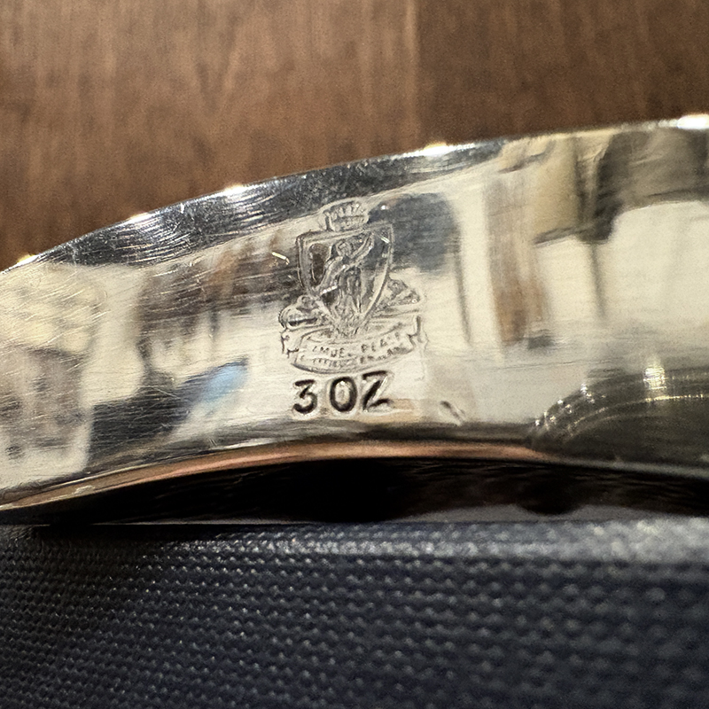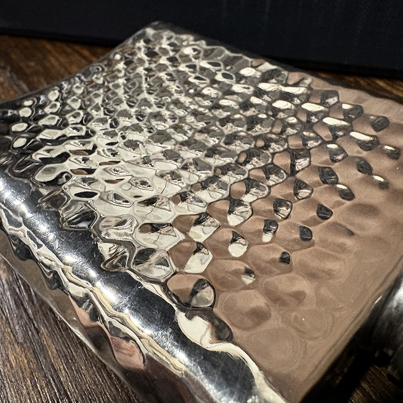 状態は、本体表面やエッジの微細な保管によるくすみや擦れこそありますが、画像からご覧いただけるようにメタル素材は非常に光沢がのこり地肌も滑らかで光沢がしっかりとあり、ハンマードのパターンも非常にクリーンでカービングの彫り溝もクリーンな非常に良好なミントコンディション相当の保管状態です。