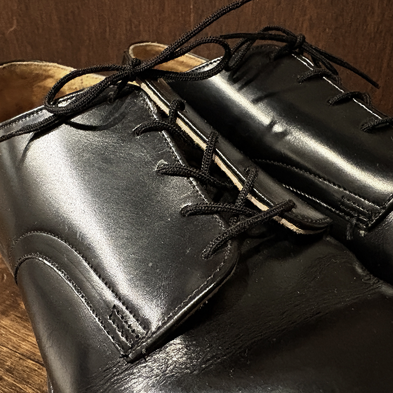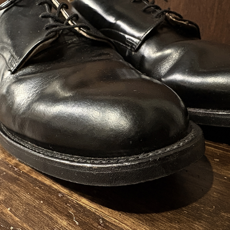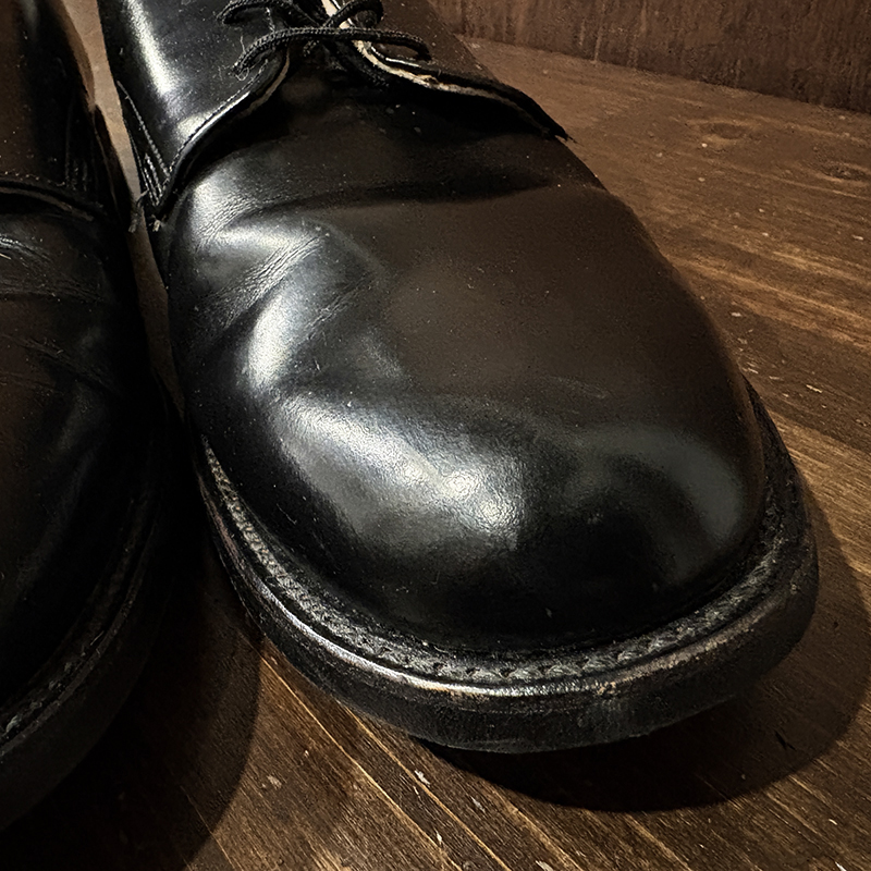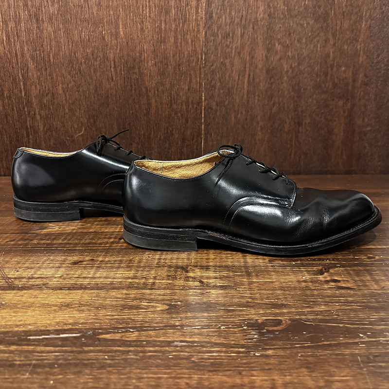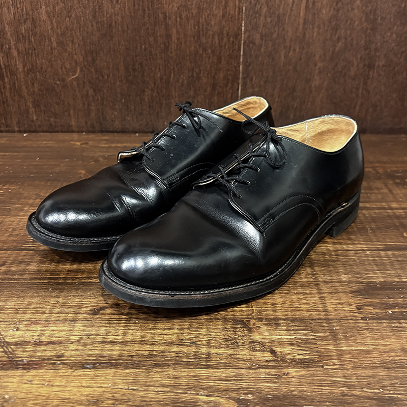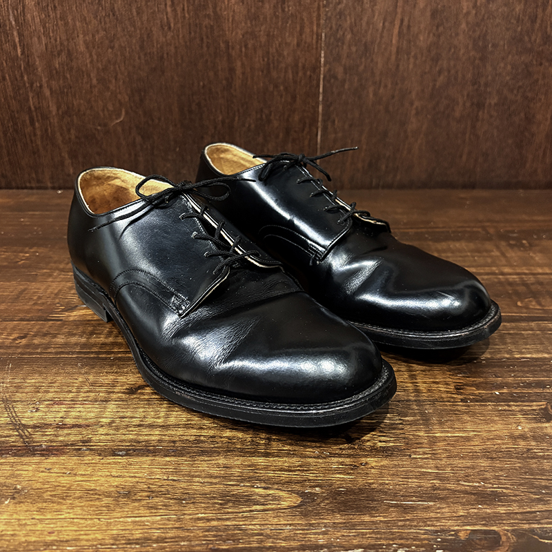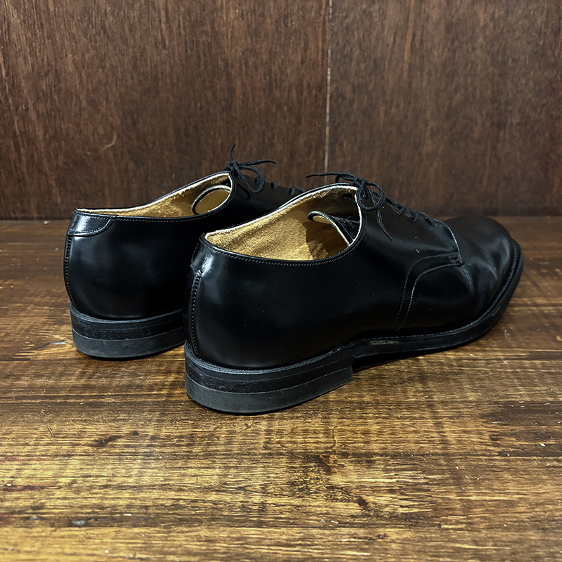 本品は80年代のアメリカ海軍支給品の本革製 サービスシューズ、アッパーは大変光沢のある牛革で堅牢なラバーソールのグッドイヤーウェルテッド製法のミリタリーシューズとしては定番的なオックスフォードレザーシューズです。