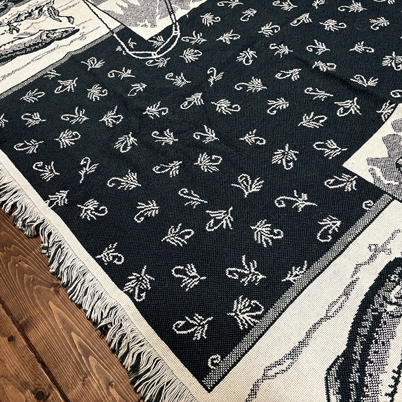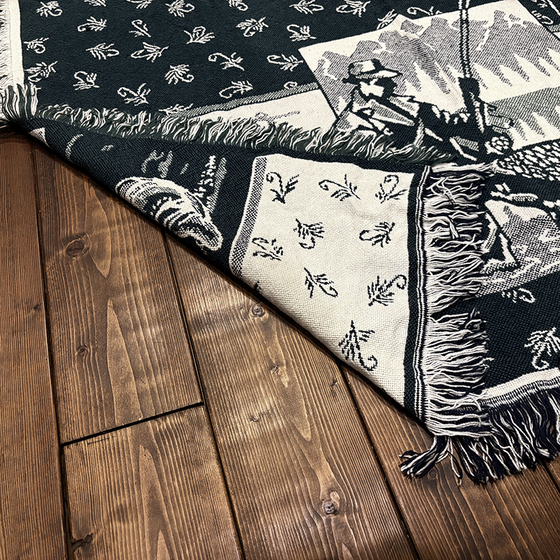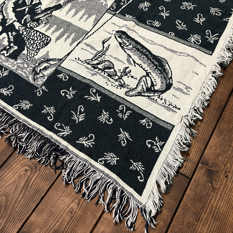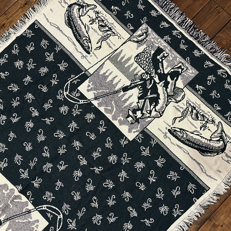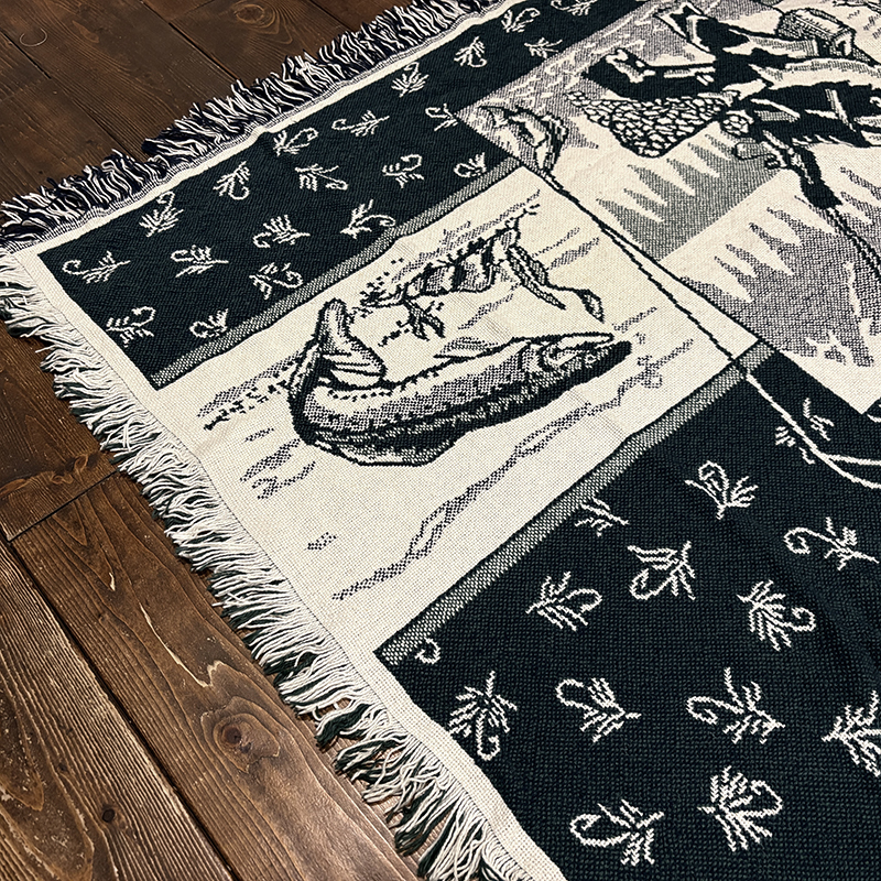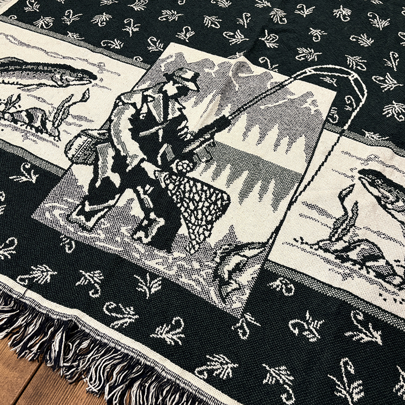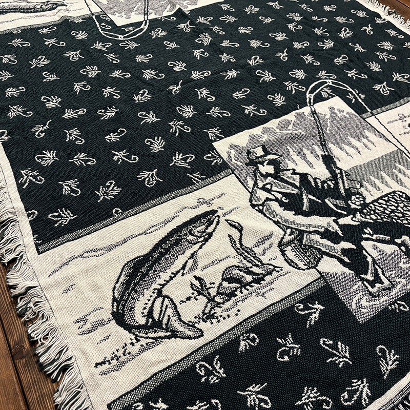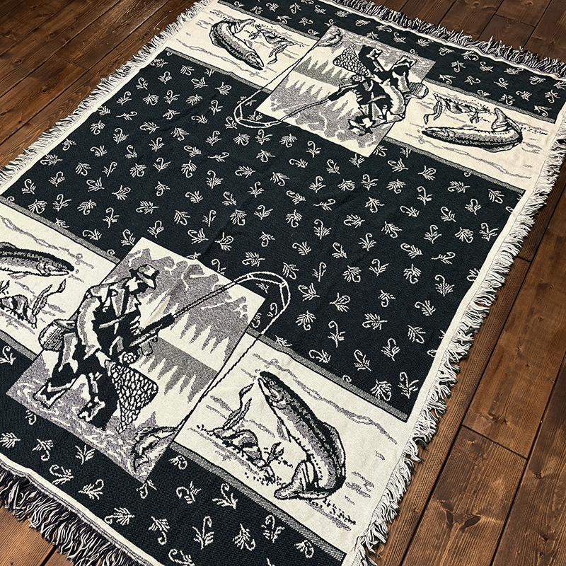 フライフィッシャーマンはじめトラウト、フライパターンがダークグリーントアイボリーのツートーンで印象的に表現されたオールドスローブランケット、シックでクラシカルなタッチの図柄がオールドらしい良い雰囲気のデザインです、キャンプやフィッシング、屋内のソファにかけたり、車内での利用や、ウォールディスプレイにも、是非ご検討ください。