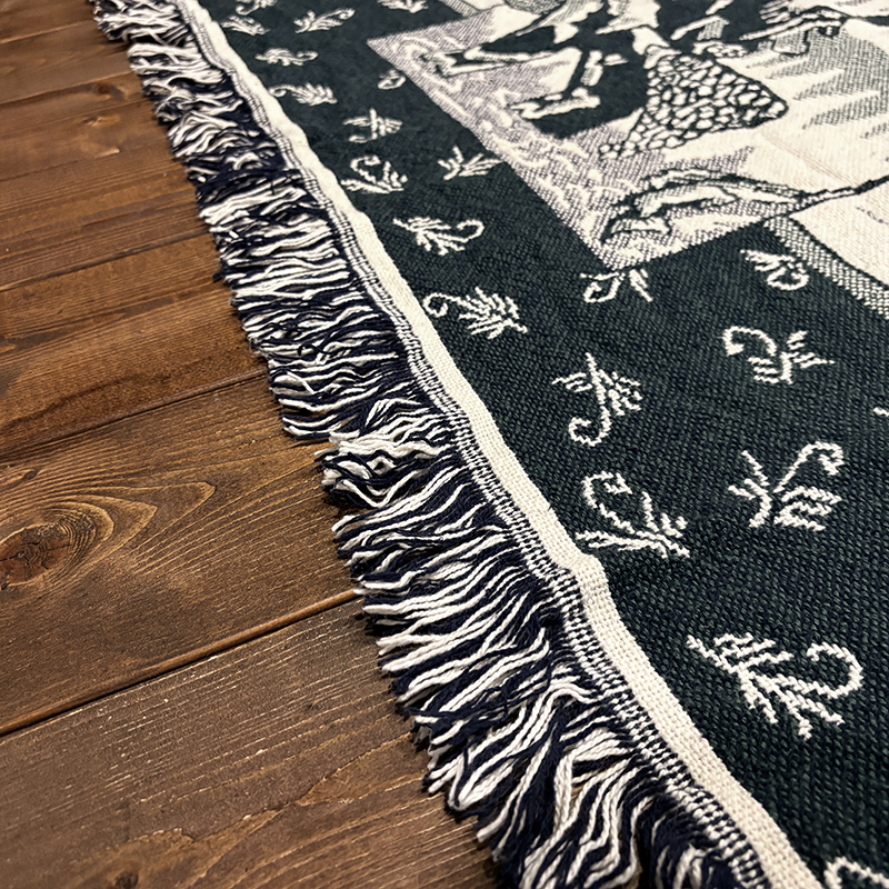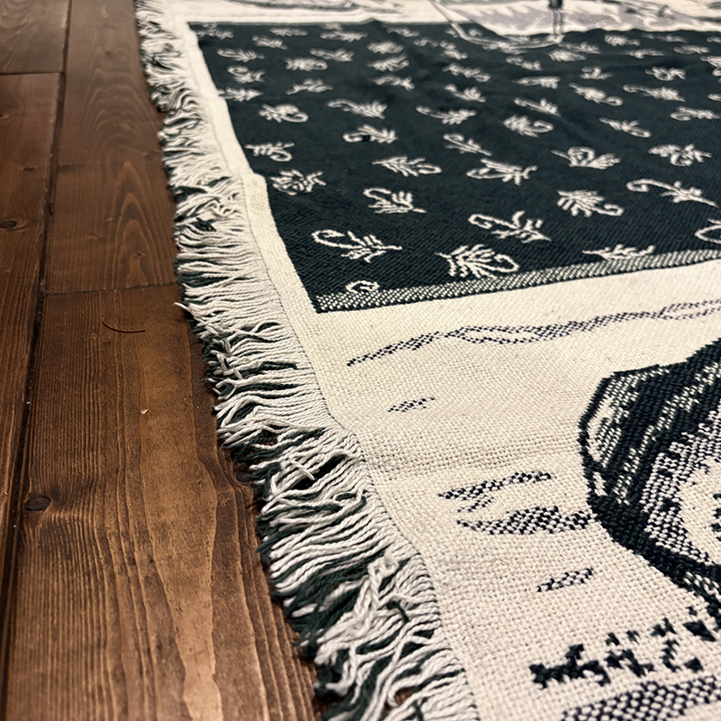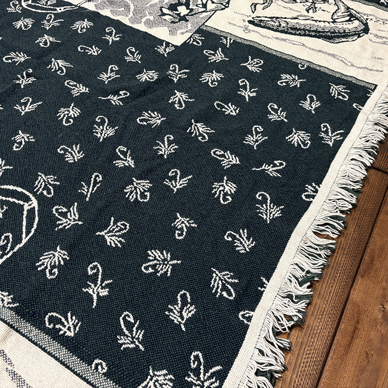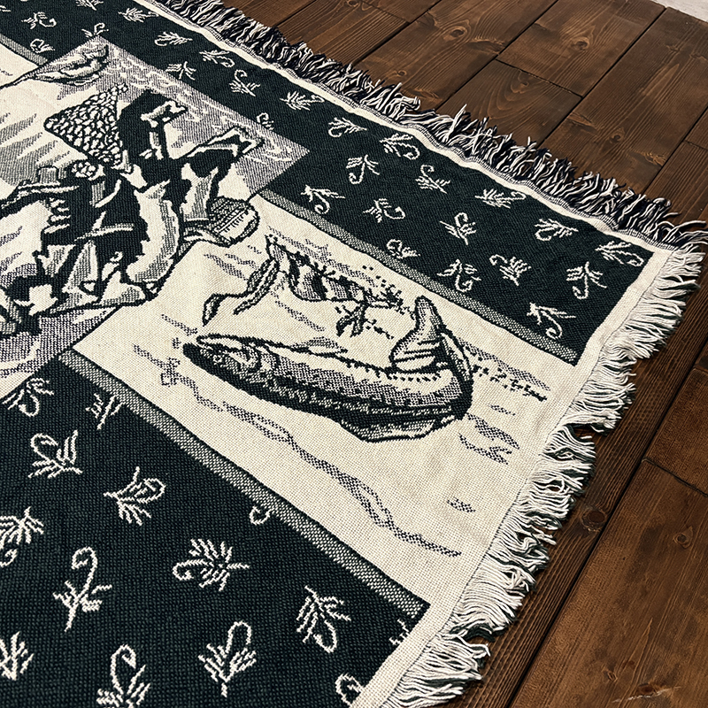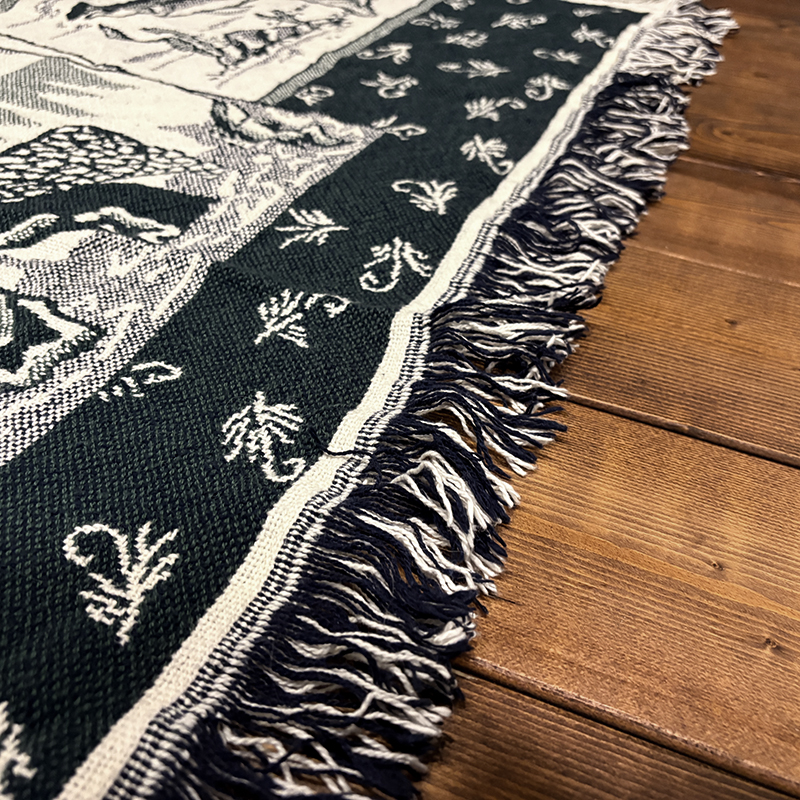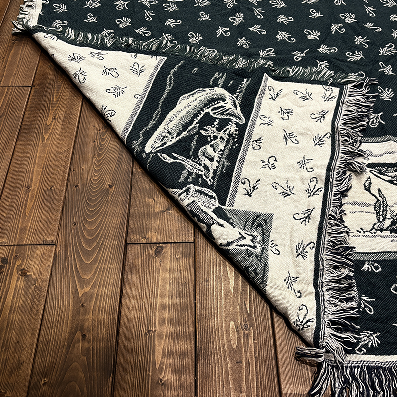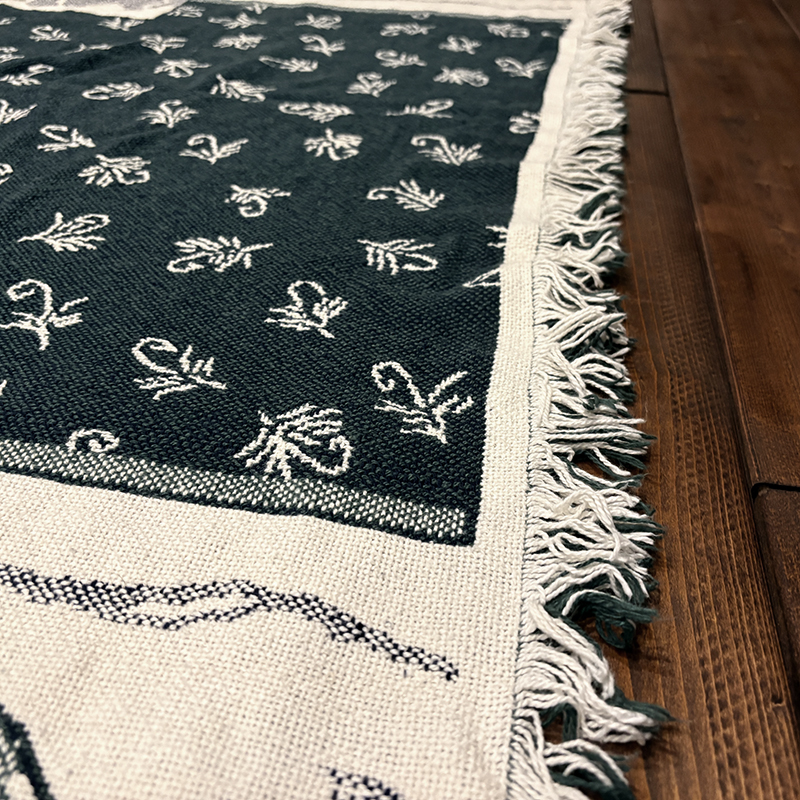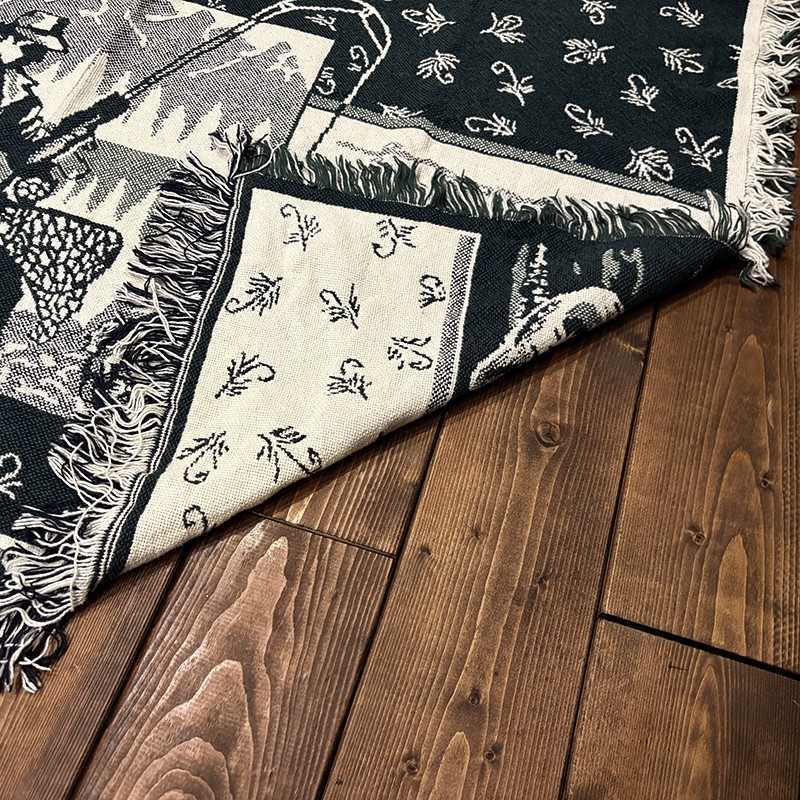 フライフィッシャーマンはじめトラウト、フライパターンがダークグリーントアイボリーのツートーンで印象的に表現されたオールドスローブランケット、シックでクラシカルなタッチの図柄がオールドらしい良い雰囲気のデザインです、キャンプやフィッシング、屋内のソファにかけたり、車内での利用や、ウォールディスプレイにも、是非ご検討ください。