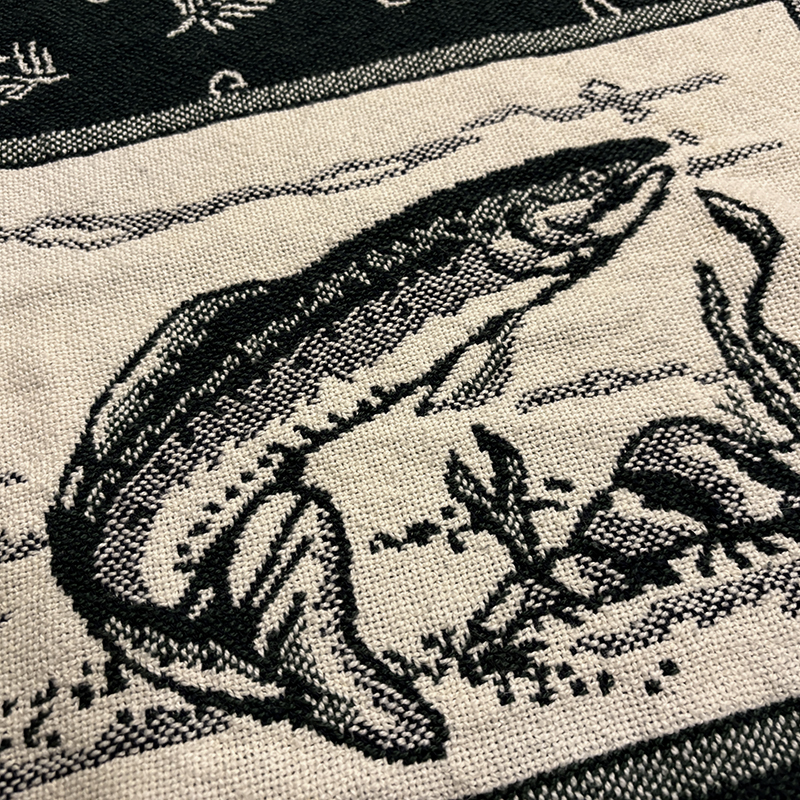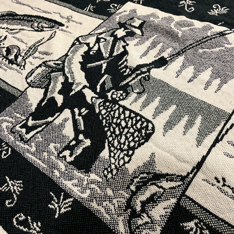 本品はフライフィッシングシーンのフィッシャーマンがトラウトをランディングしようとするシーンをメインにフライパターンやトラウトがレイアウトされたアウトドアらしいパターンの一枚、当時の荒い織り機の細部の風合いが非常に良い雰囲気となっています。