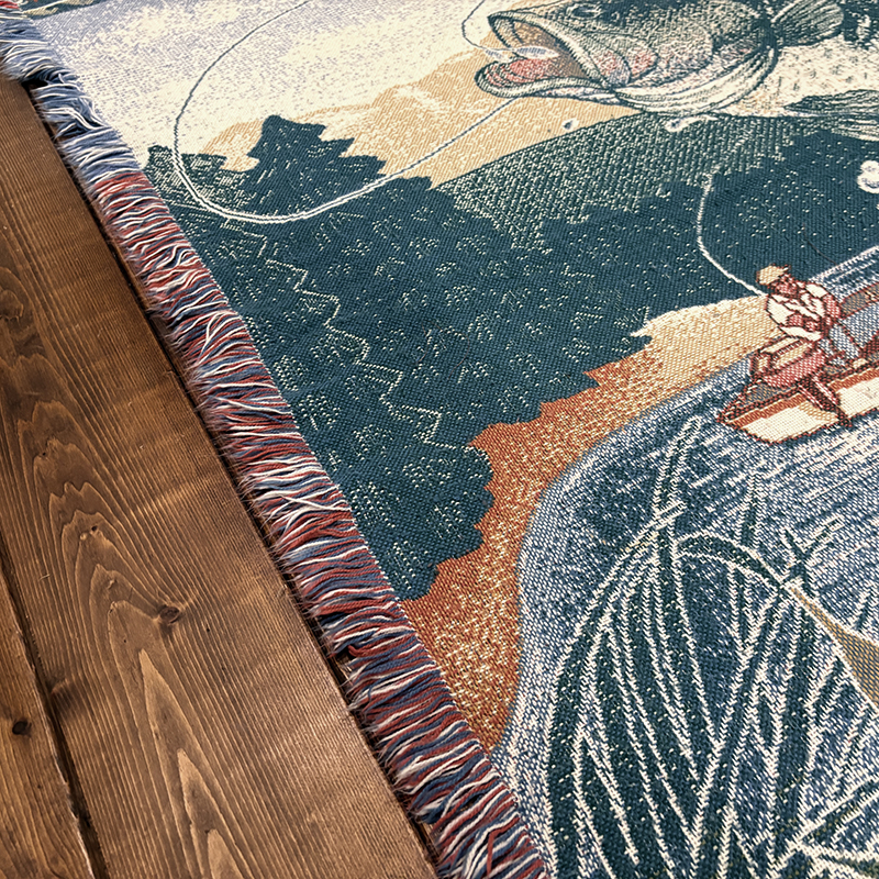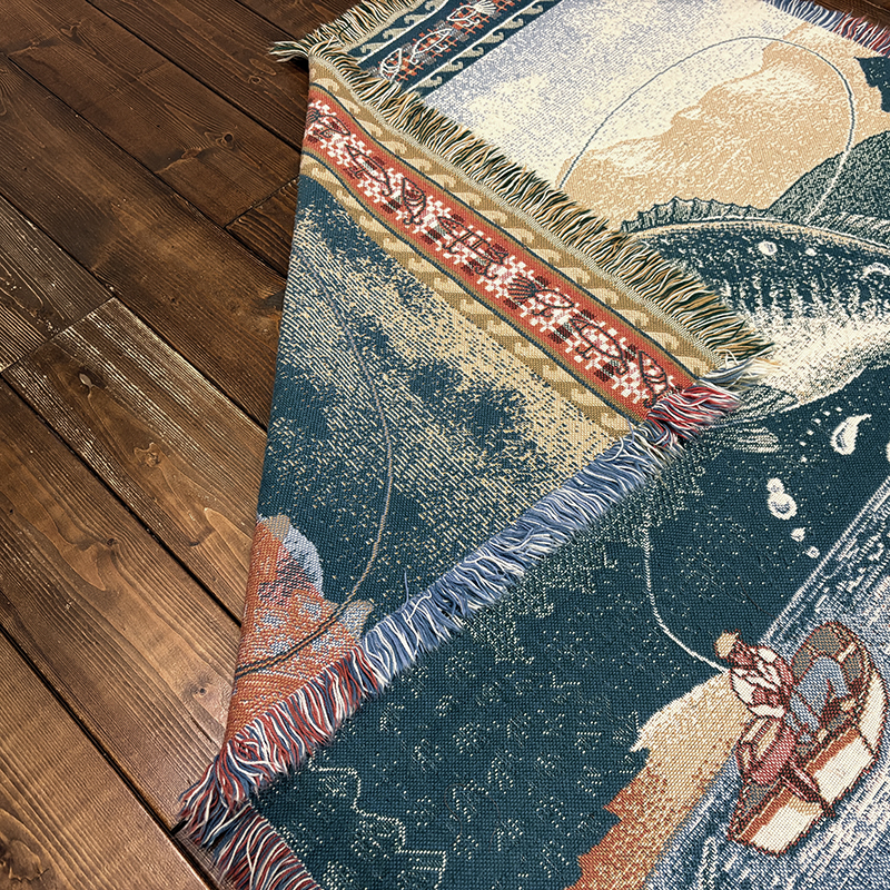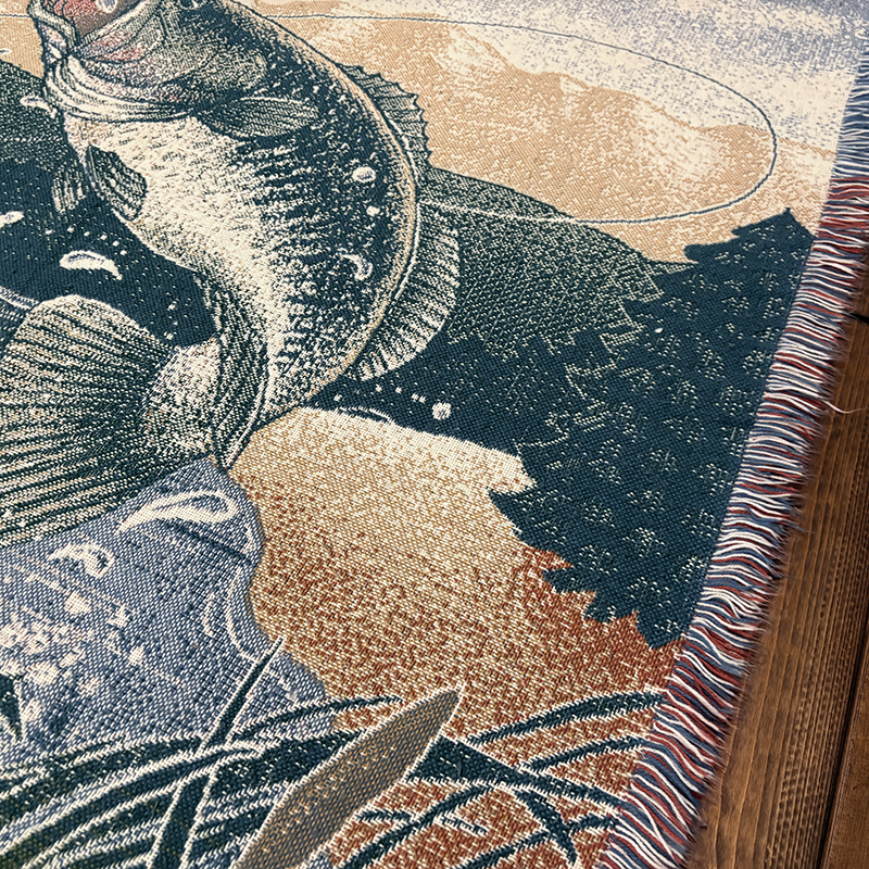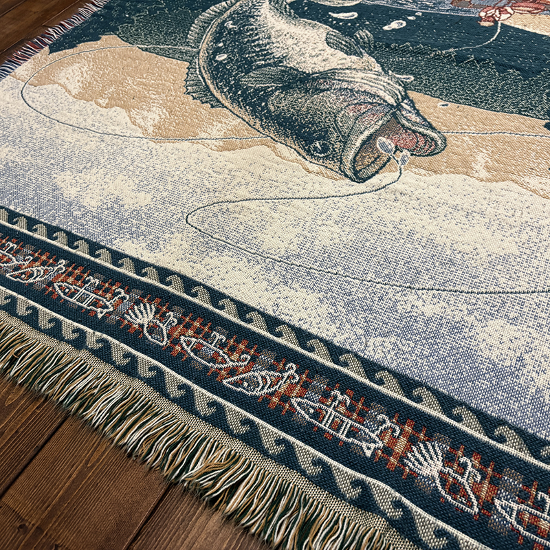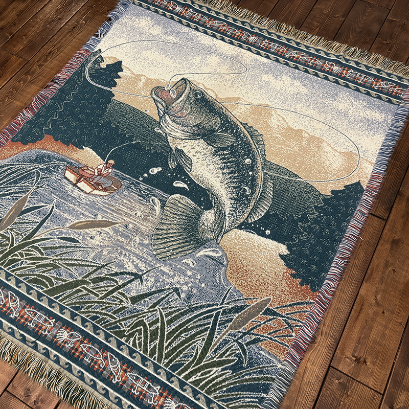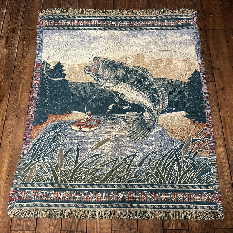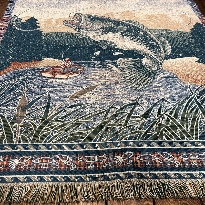 ボートに乗ったフィッシャーマンと迫力のジャンピングバスとのやりとりの瞬間を印象的に表現したオールドスローブランケット、フィールドの背景描写やルアーフレームのデザインも当時らしい素朴な印象を与えてくれる一品です、キャンプやフィッシング、屋内のソファ、車内での利用、ウォールディスプレイにも、是非ご検討ください。