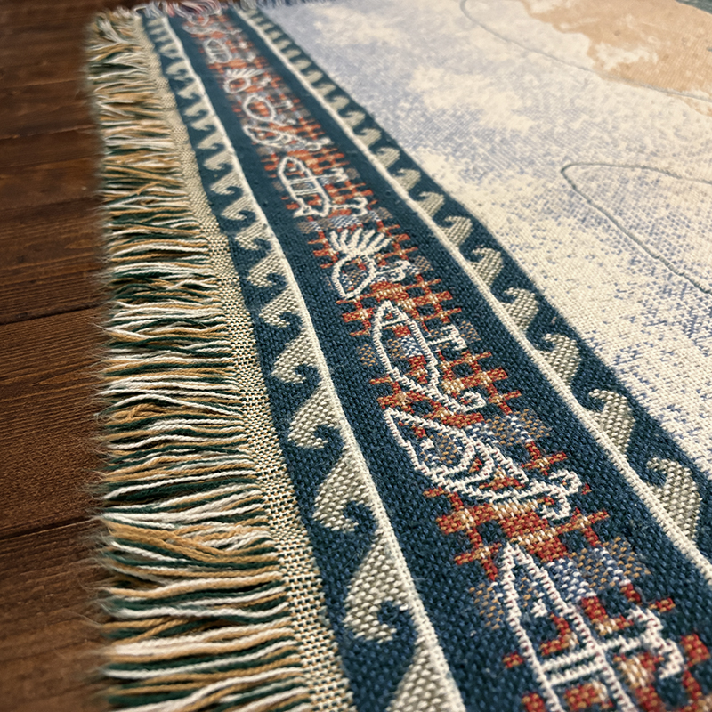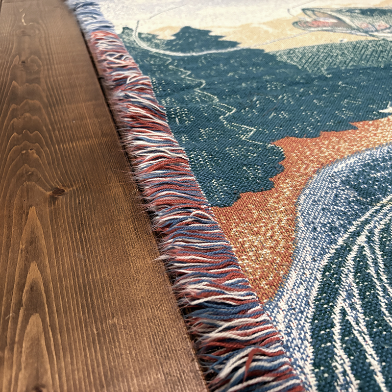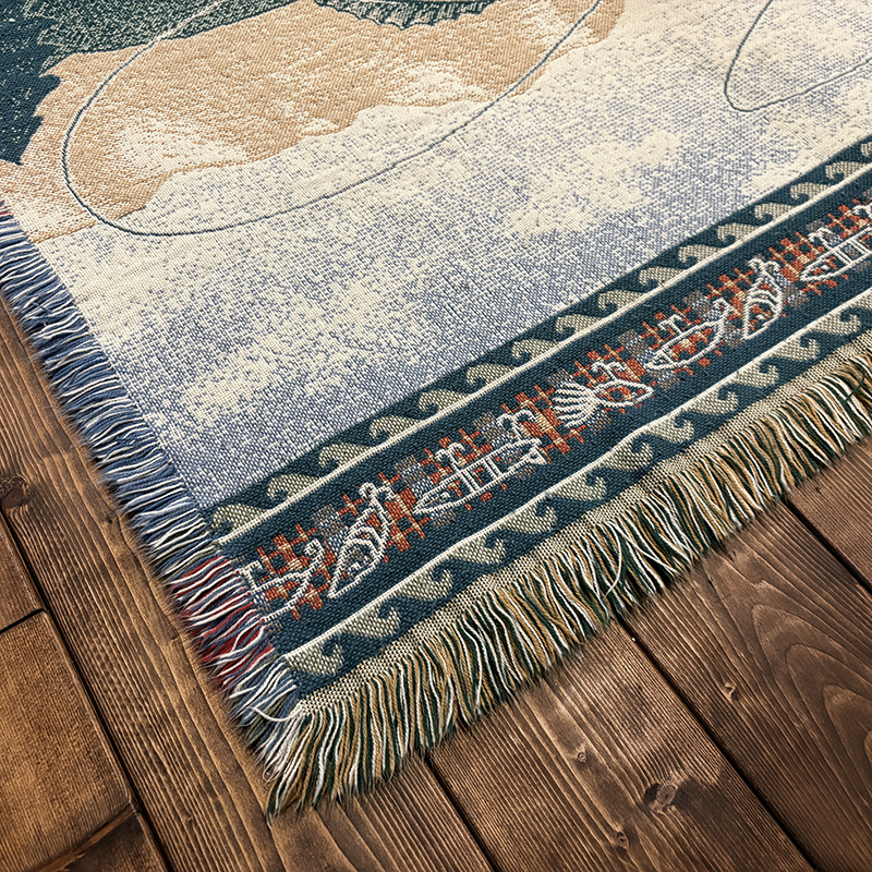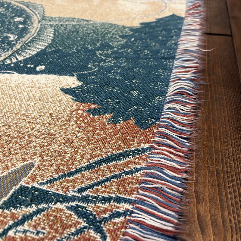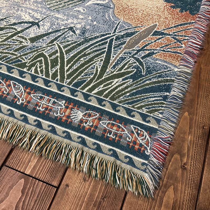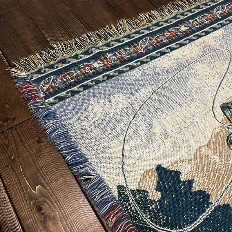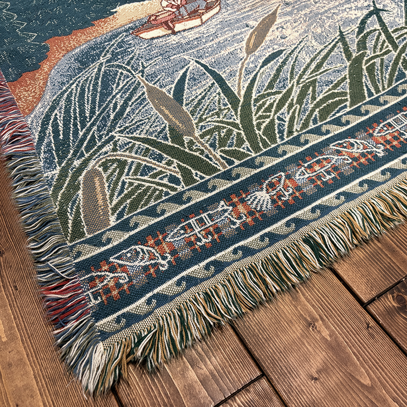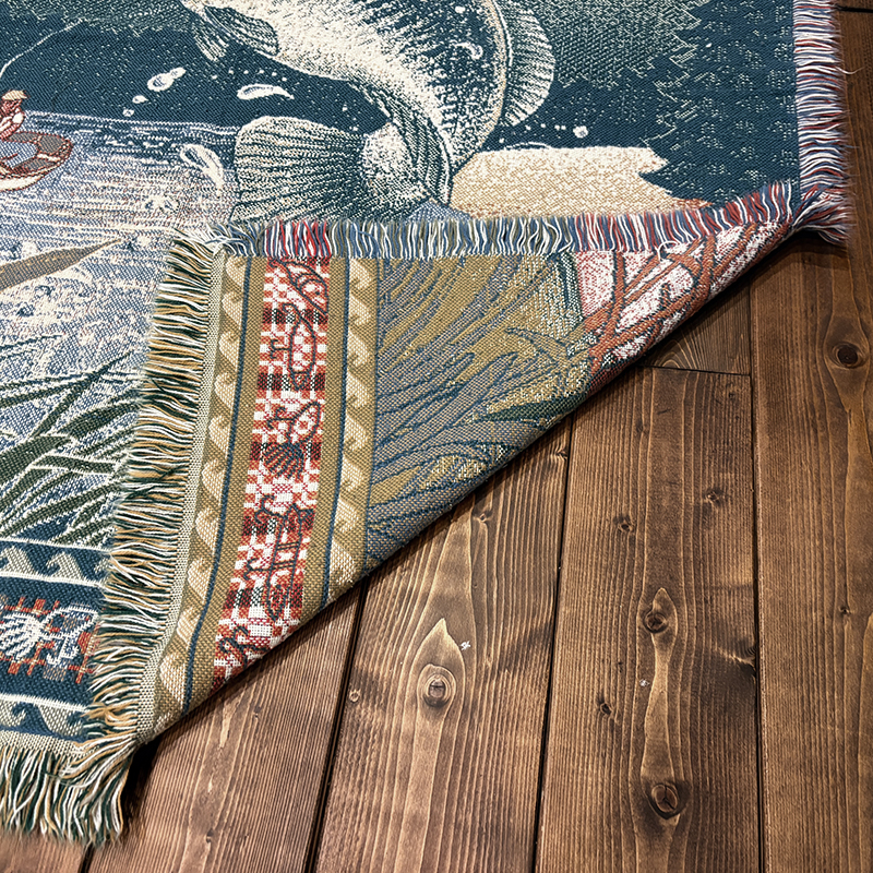 ボートに乗ったフィッシャーマンと迫力のジャンピングバスとのやりとりの瞬間を印象的に表現したオールドスローブランケット、フィールドの背景描写やルアーフレームのデザインも当時らしい素朴な印象を与えてくれる一品です、キャンプやフィッシング、屋内のソファ、車内での利用、ウォールディスプレイにも、是非ご検討ください。