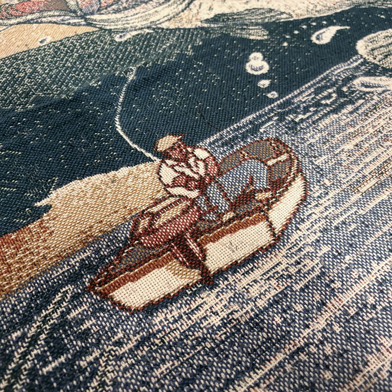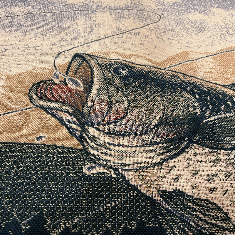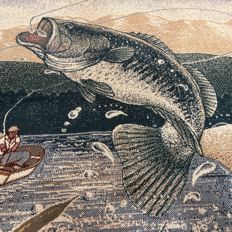 本品はボートに乗ったフィッシャーマンと今にもルアーにバイトしようとするラージマウスバスをメインモチーフにしたアウトドアらしいフィッシングシーンの一コマが表現された一枚、当時の荒い織り機の細部の風合いが非常に良い雰囲気となっています。