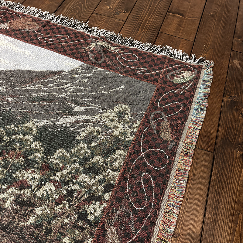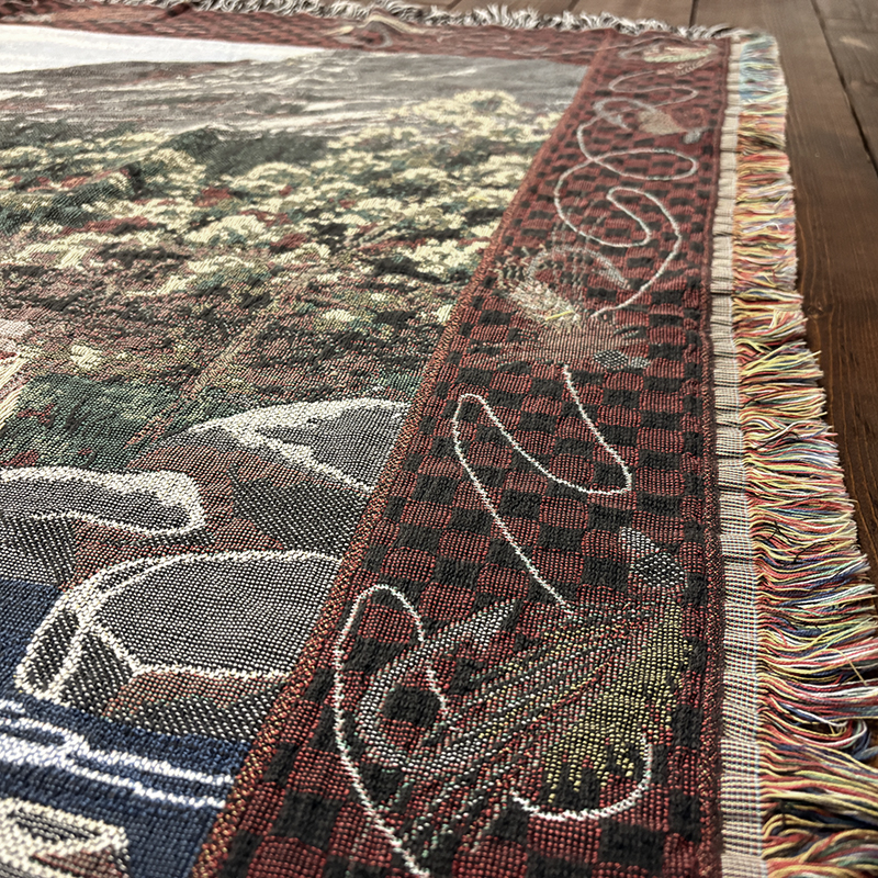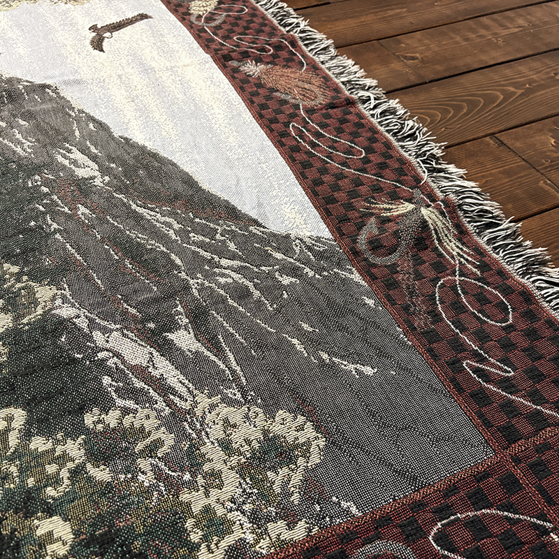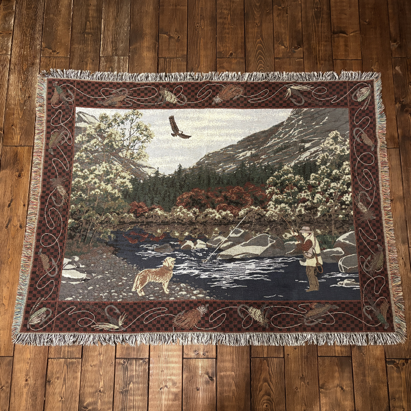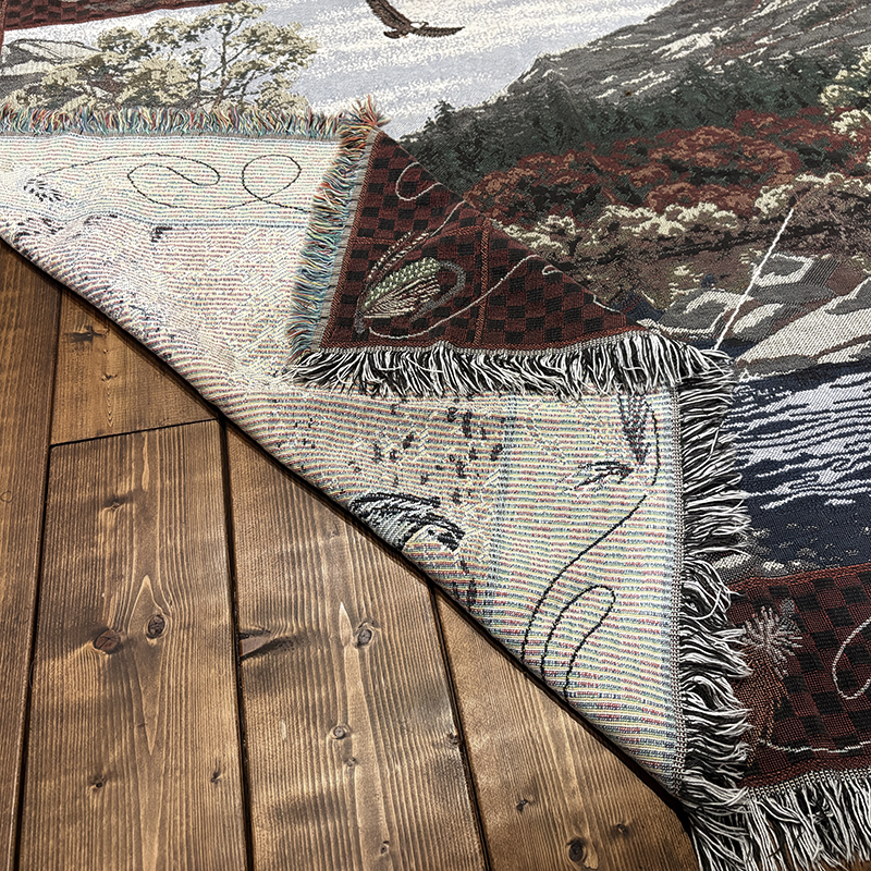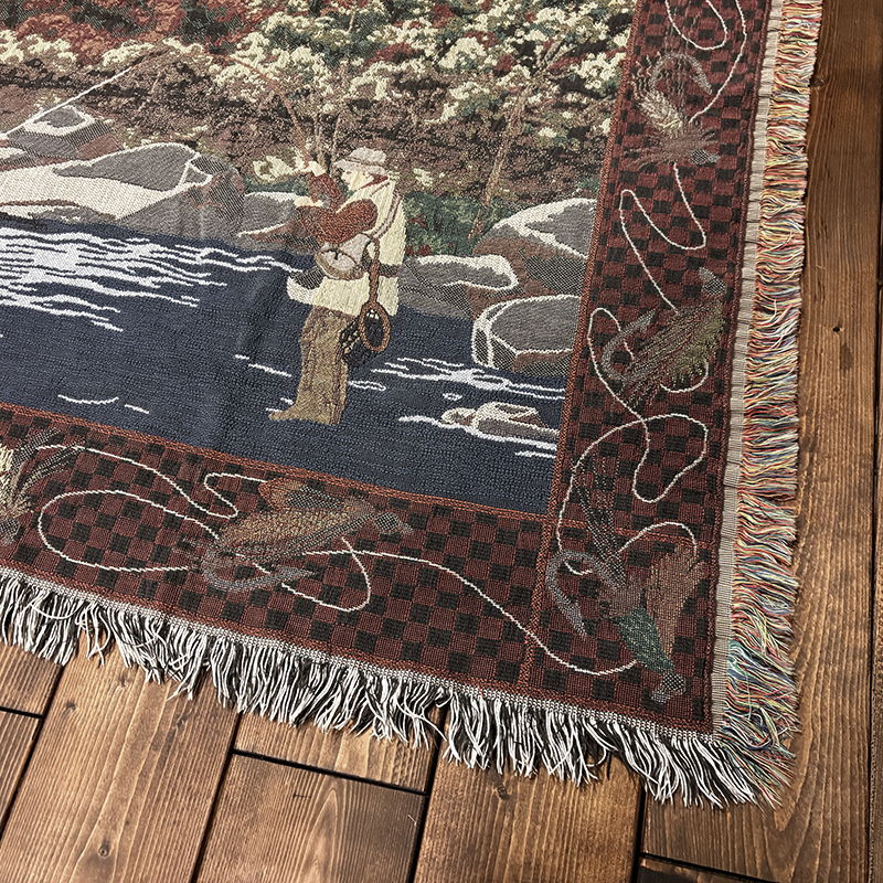 フライフィッシャーマンが印象的に表現されたオールドスローブランケット、フィッシングシーンはじめラインや毛鉤のフレームデザインがブランケット全体のデザインをよりクラシカルな印象にまとめています、キャンプやフィッシング、屋内のソファにかけたり、ウォールディスプレイにも、是非ご検討ください。