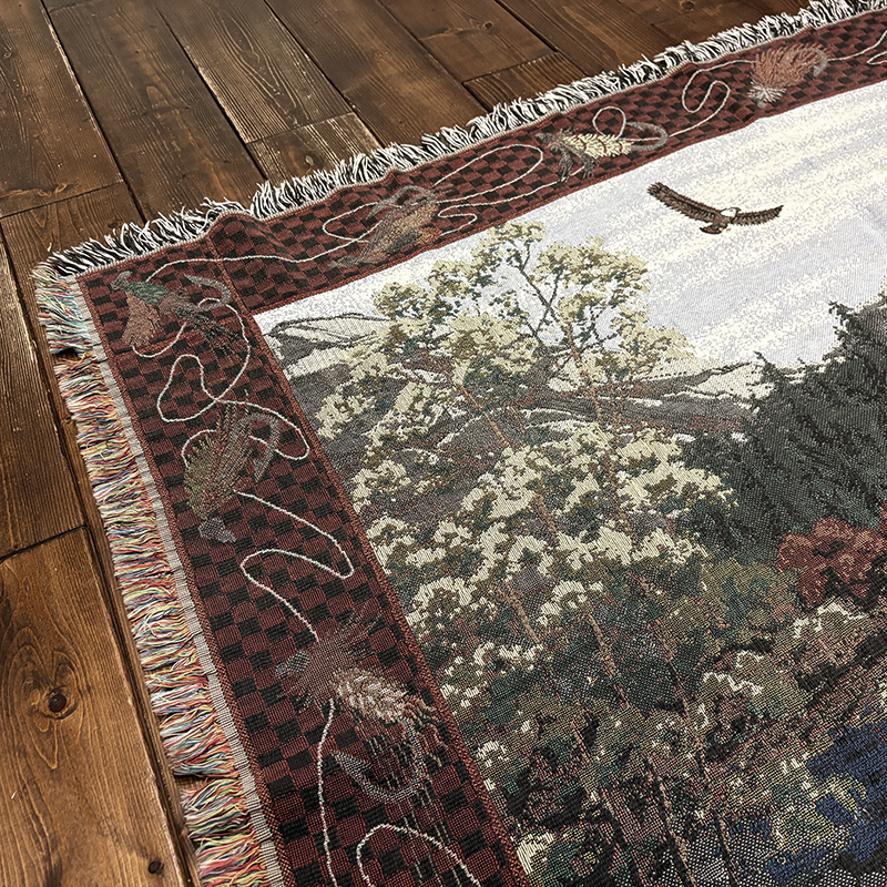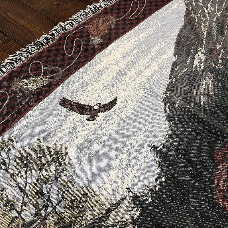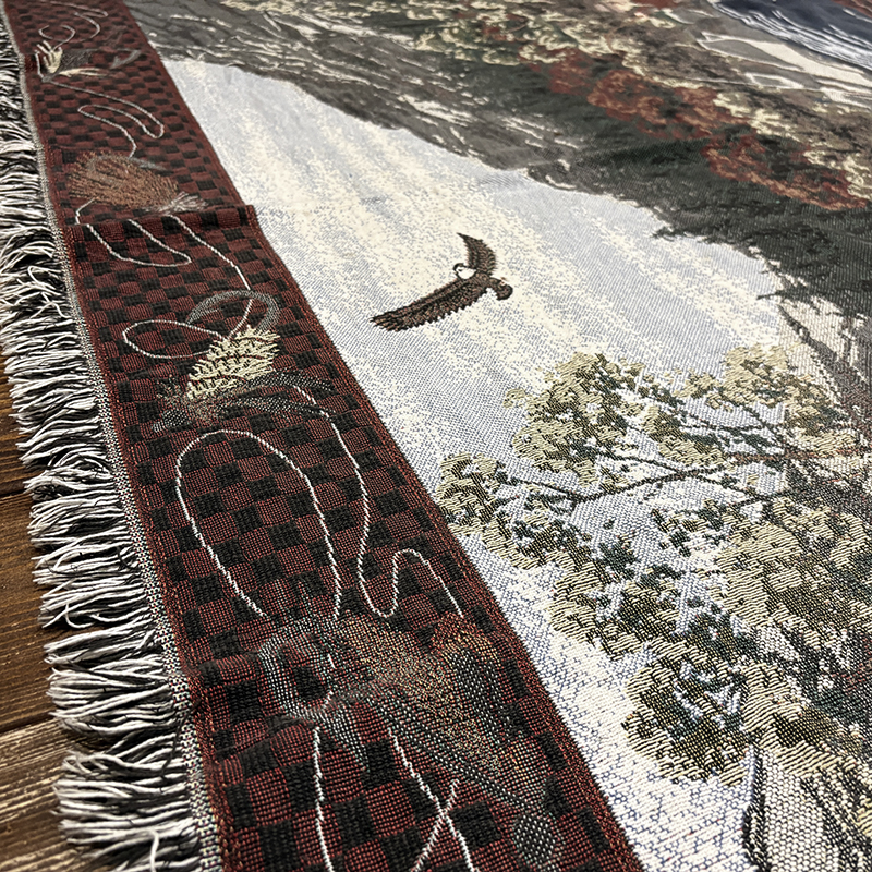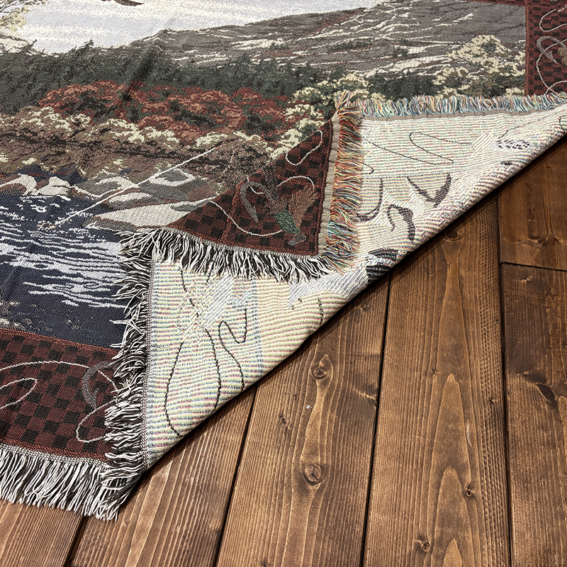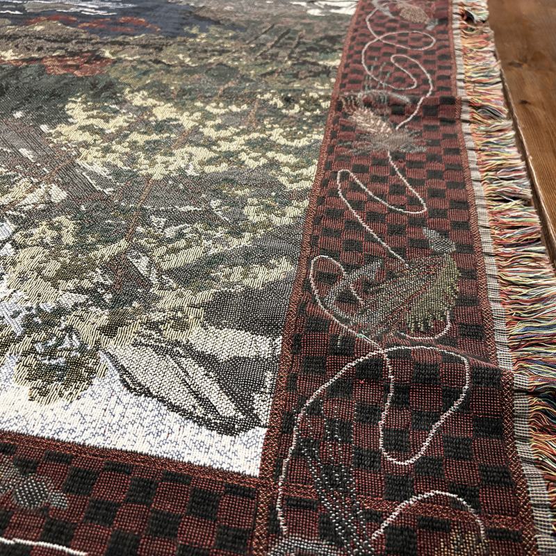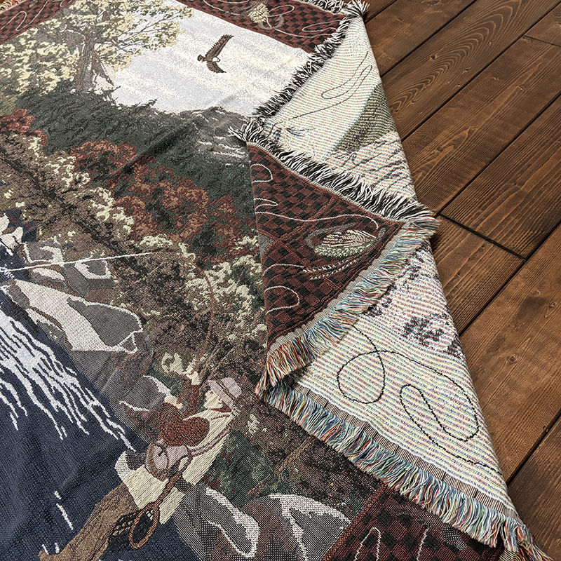 フライフィッシャーマンが印象的に表現されたオールドスローブランケット、フィッシングシーンはじめラインや毛鉤のフレームデザインがブランケット全体のデザインをよりクラシカルな印象にまとめています、キャンプやフィッシング、屋内のソファにかけたり、ウォールディスプレイにも、是非ご検討ください。
