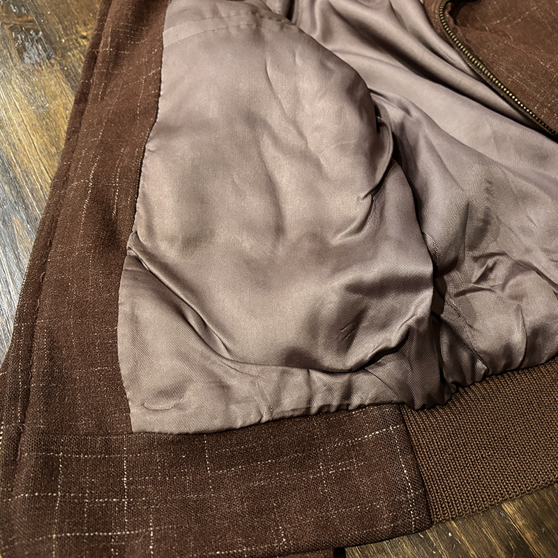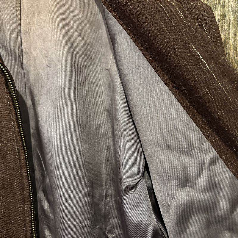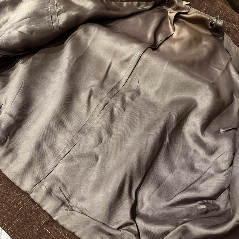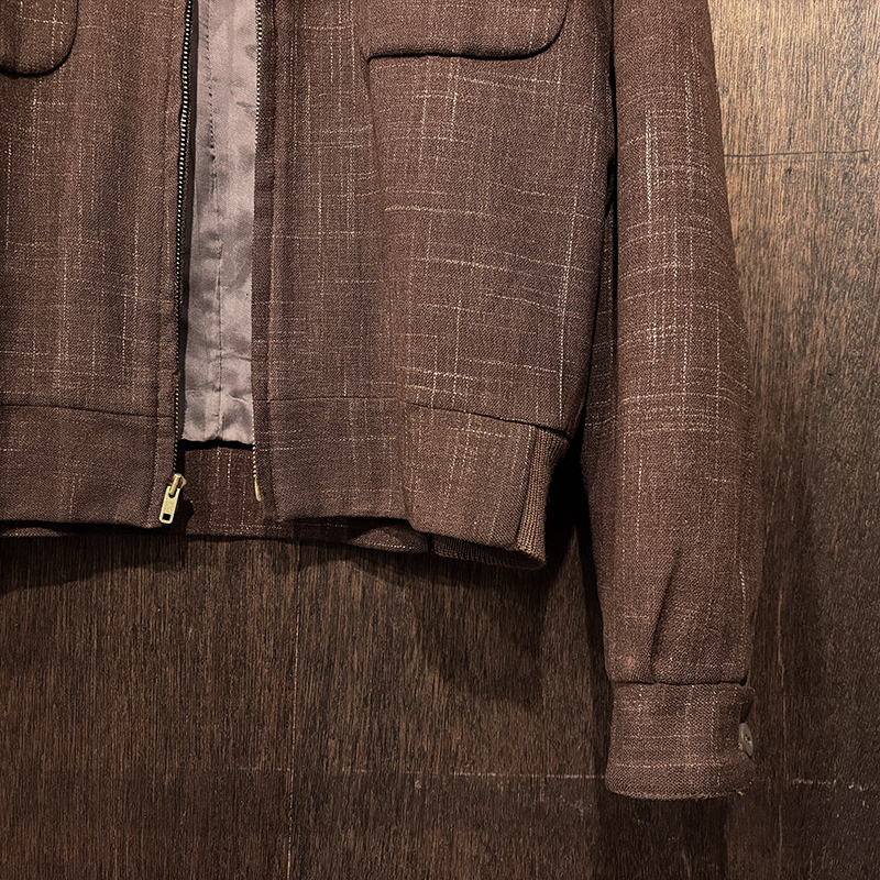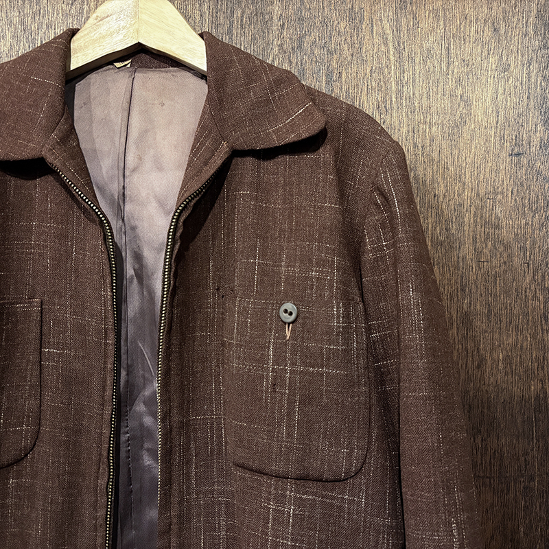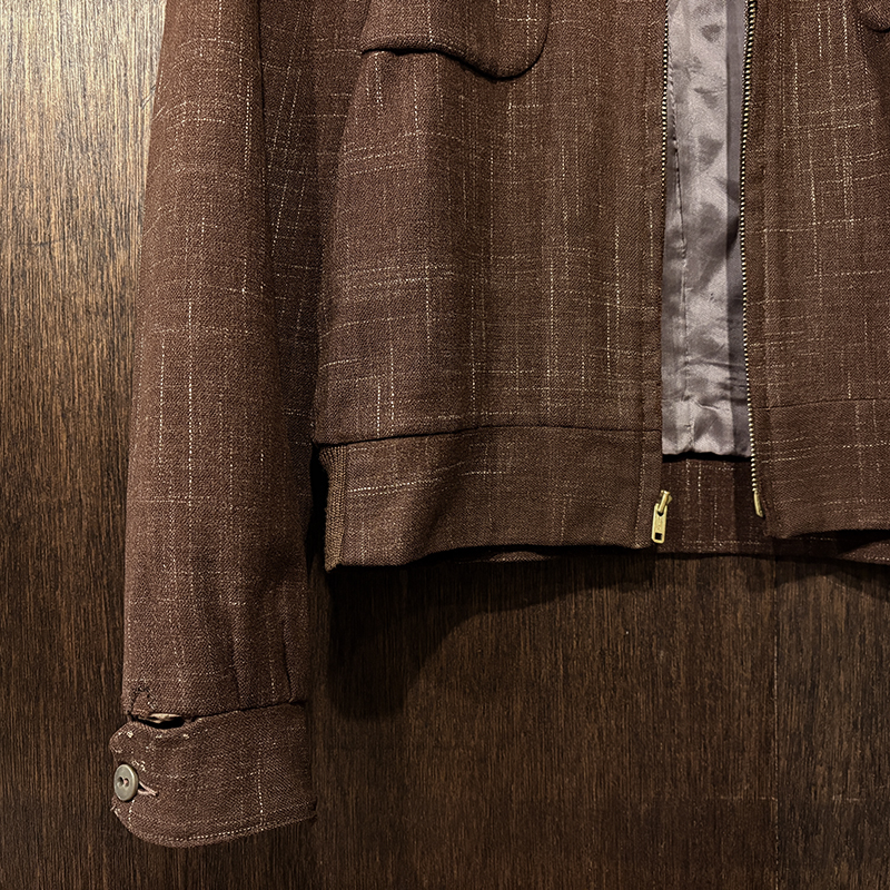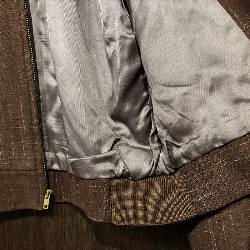 フロントは左右にボタン開閉のポケット仕様となっており、メインフロントジッパーは当時のブラス製 Talonジップ、襟も当時らしいディテールの袋襟、袖先はカフス仕様で、腰サイドのみのブラウンリブ、肩パッドも入っておらずシルエットも良く、インナー側は滑りの良いレーヨンサテンと特有の5,60年代らしいビンテージジャケットのデザインでまとまっています。