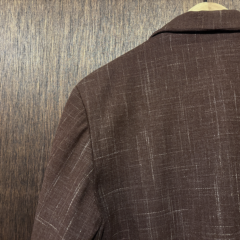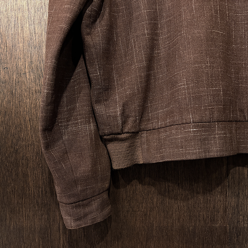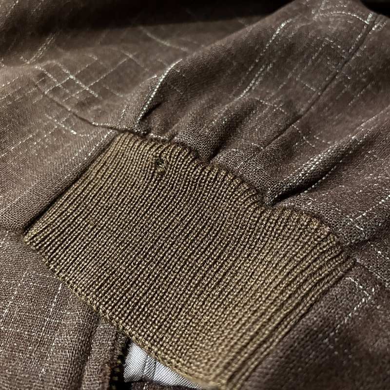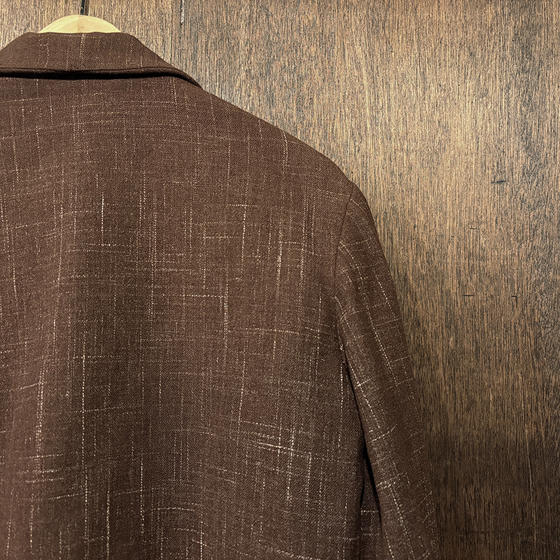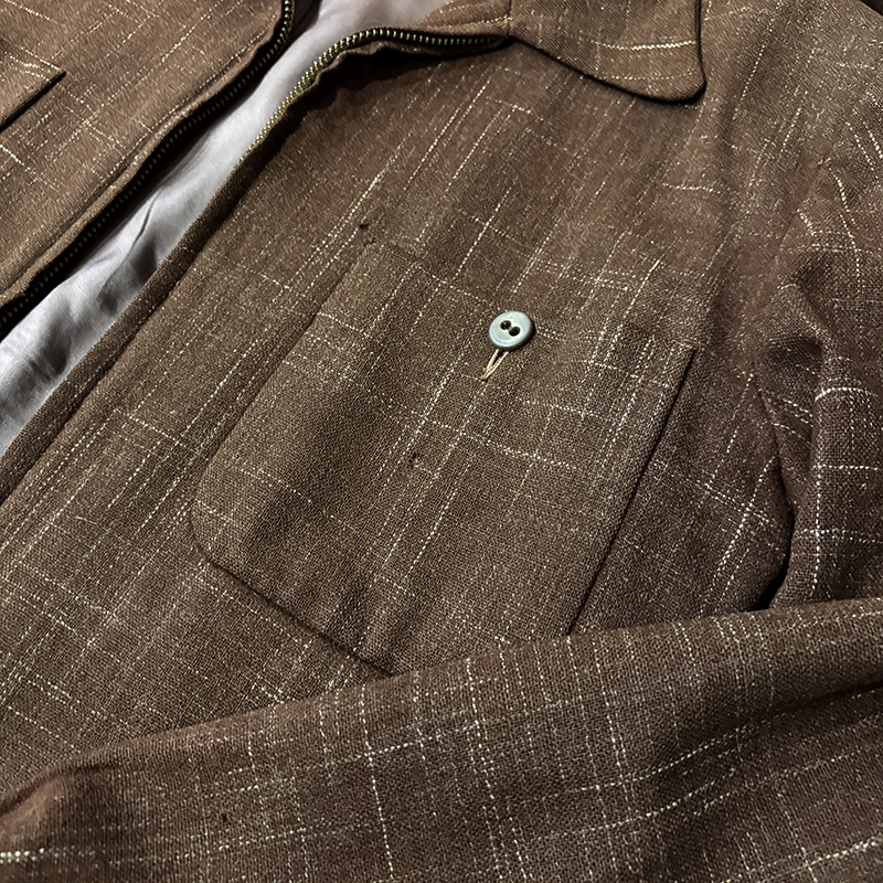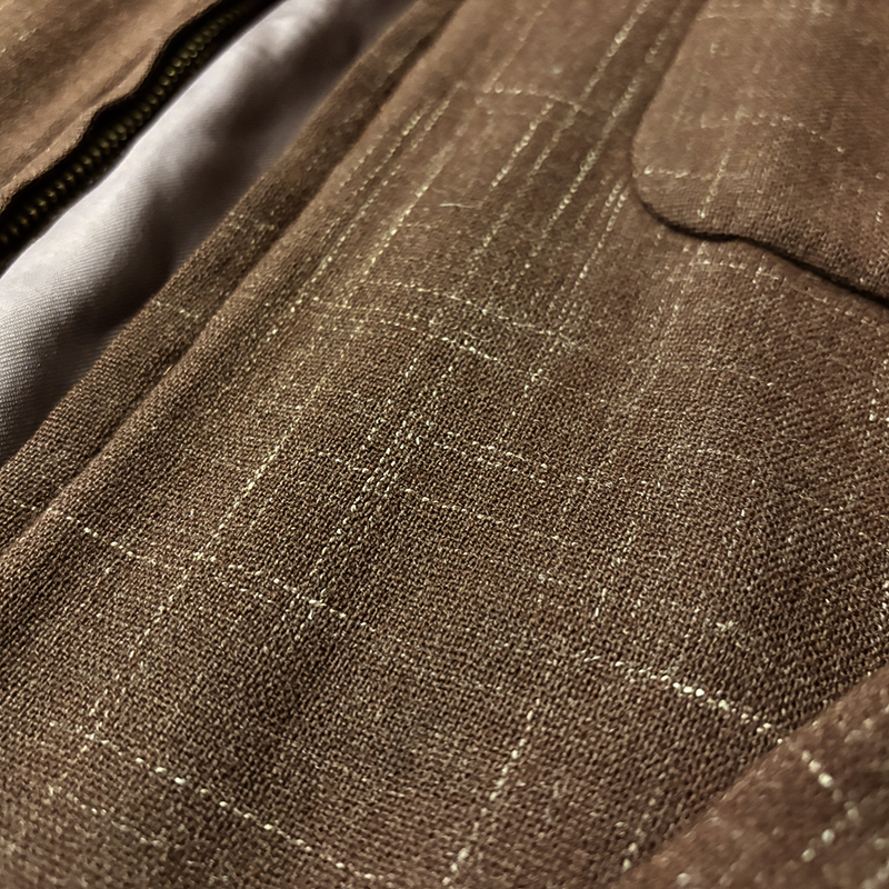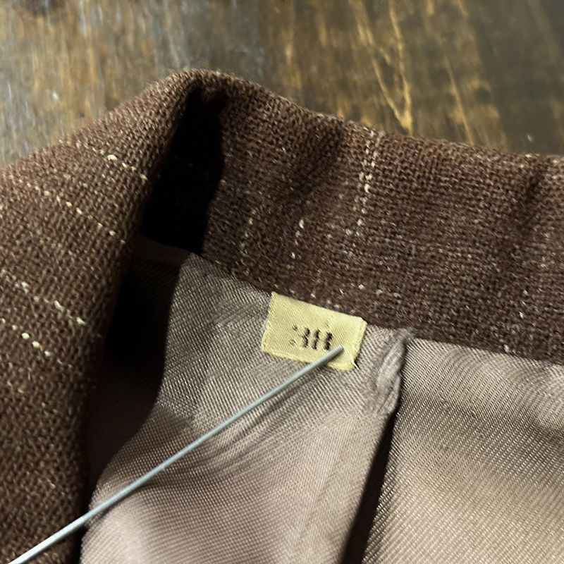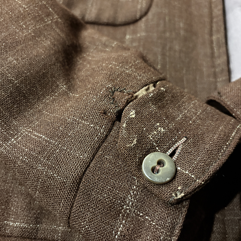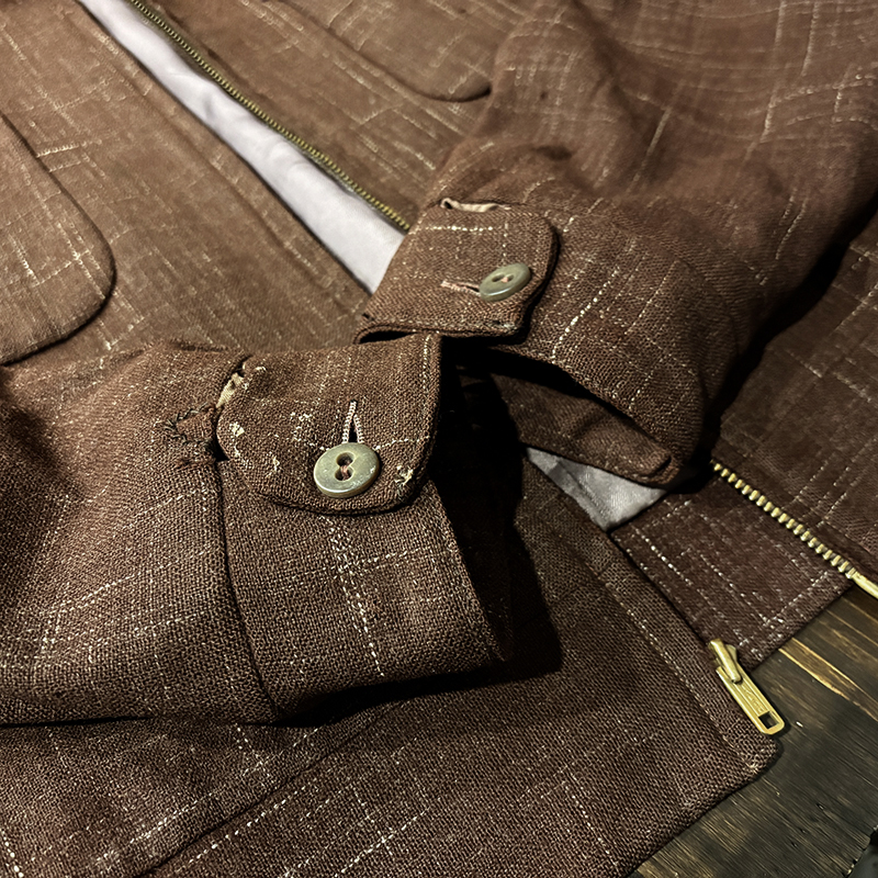 メインマテリアルのウール生地には当時らしい通称カスリと呼ばれる大変渋いトーンのブラウンベースにライトな線状繊維で折り重なり擦れたようなデザインが良い絣紋様が大きな特徴となっています。